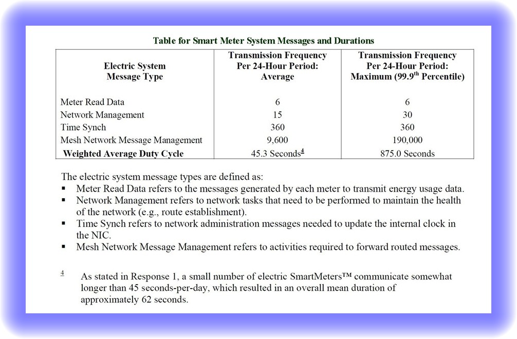 Presented below is information presented before the Public Utilities Commission of the State of California in 2011 was intended to provide clarification on the frequency and duration of RF emissions from wireless smart meters.  The table below presents data for “scheduled” messages for Pacific Gas and Electric Company’s wireless smart meters operating in the 900 MHz range.  Scheduled messages are defined as those inherently required to sustain communications in the network that occur routinely without user intervention.  You can click on the table to enlarge for easier viewing.  [For the entire document, refer to:  PGE ALJ Response 01 NOV 2011 CPUC Document.]