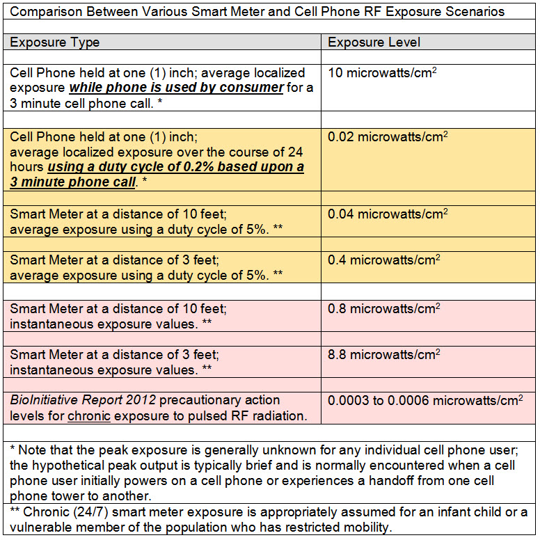 More importantly, beyond the discussion of exposure to RF emissions based upon averaging over a 24-hour period, the relevant parameter for evaluating potential adverse health effects is the chronic exposure to frequent and pulsed signals from a smart meter. In this example scenario, the instantaneous power density values for a smart meter during signal transmission of 0.8 and 8.8 microwatts/cm2 for 10 feet and 3 feet respectively are those of interest in comparison to The BioInitiative Report 2012 precautionary action levels. With action levels being in the range of 0.0003 to 0.0006 microWatts/cm2 for chronic exposure to pulsed RF radiation, it is evident that smart meter instantaneous exposure levels are over a thousand times higher than those expected to be able to cause observed negative health effects.
