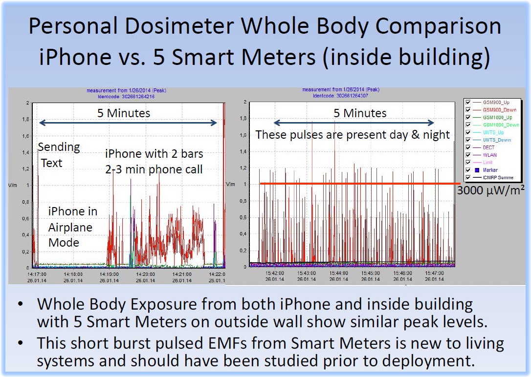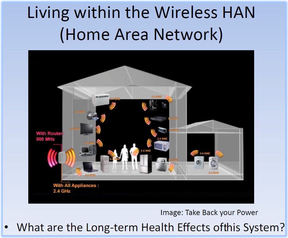 “Here’s the big issue.  When smart meters were rolled out there weren’t any scientific studies done by the industry, and I  think that is a grave absence of social responsibility.  Before you put a microwave transmitter on your house no matter how powerful or how weak, you need to do scientific studies before you subject the population to that.  This is an epidemiological experiment of tremendous proportions and we are all the guinea pigs.”
