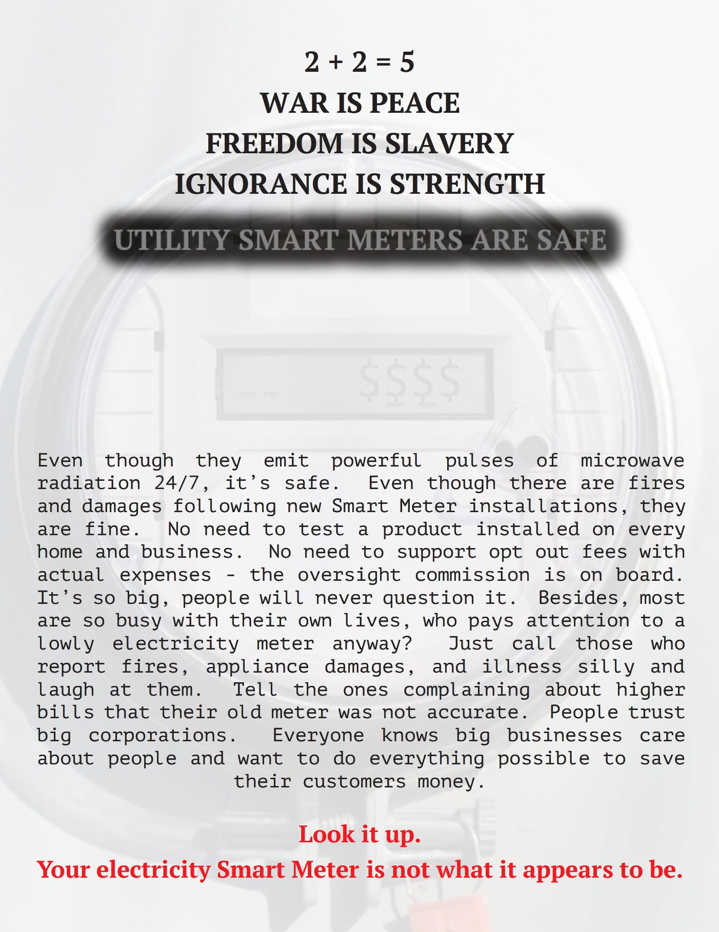 Smat Meters Are (not) Safe.CaptionThe Maryland Smart Meter Awareness (MSMA) group has published an eye-catching poster intended to highlight the Orwellian nature of  how smart meters have been deployed and declared “safe.”