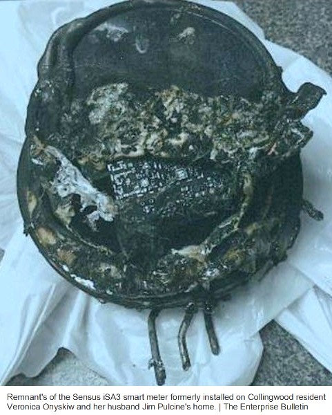 Last week we reported on a ‘Ball of Fire’ from a Smart Meter Explosion at a home in Ontario, Canada. Today the local media ran a story with a photo capturing the remnants of the smart meter for the Collingwood home.