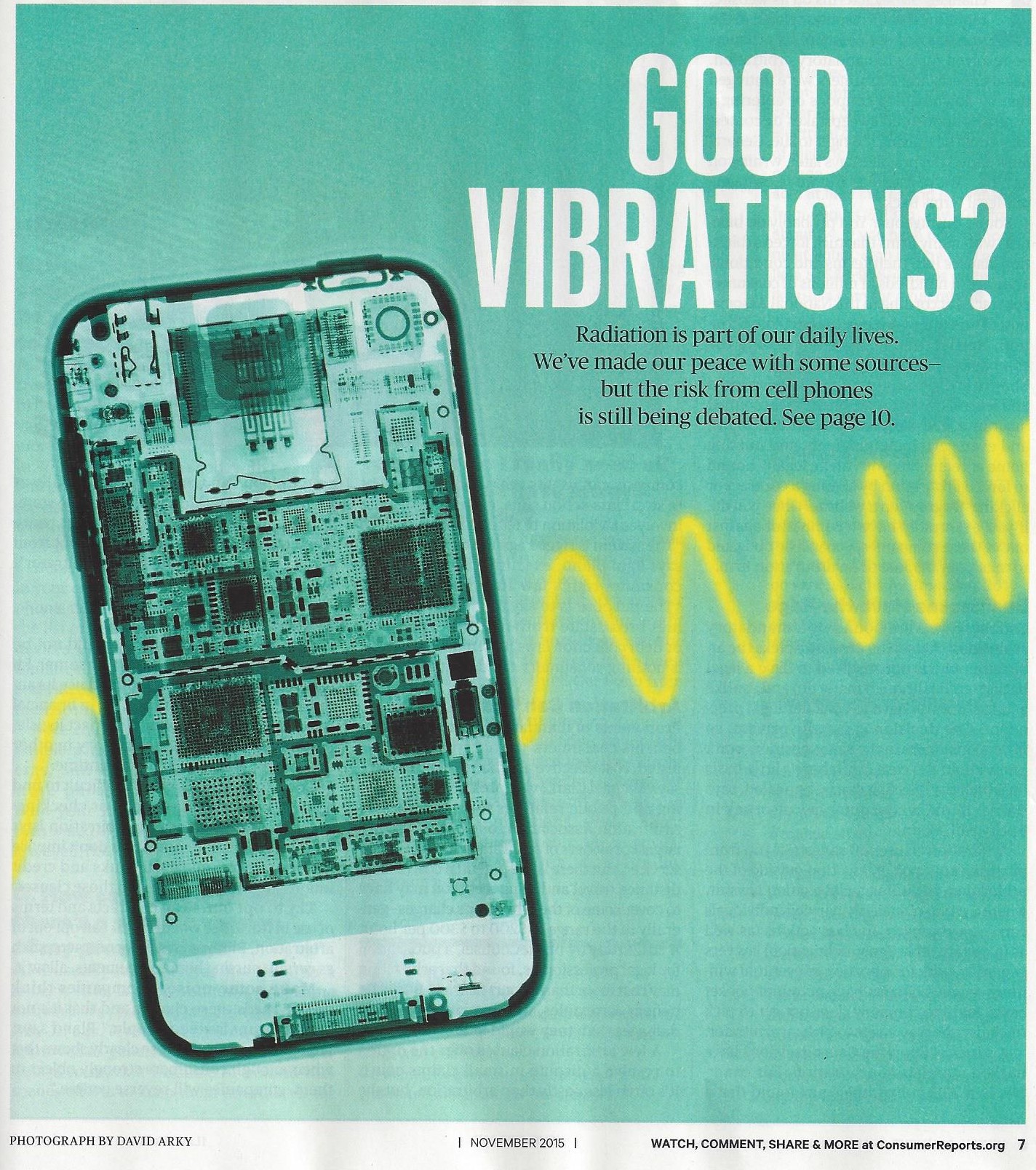 It is noted that the version of the above Consumer Reports article which was included in the November 2015 issue of its hardcopy magazine was less direct in its title and somewhat contradictory to the subject matter. One page says, “Good Vibrations? Radiation is part of our daily lives. We’ve made our peace with some sources — but the risk from cell phones is still being debated.”