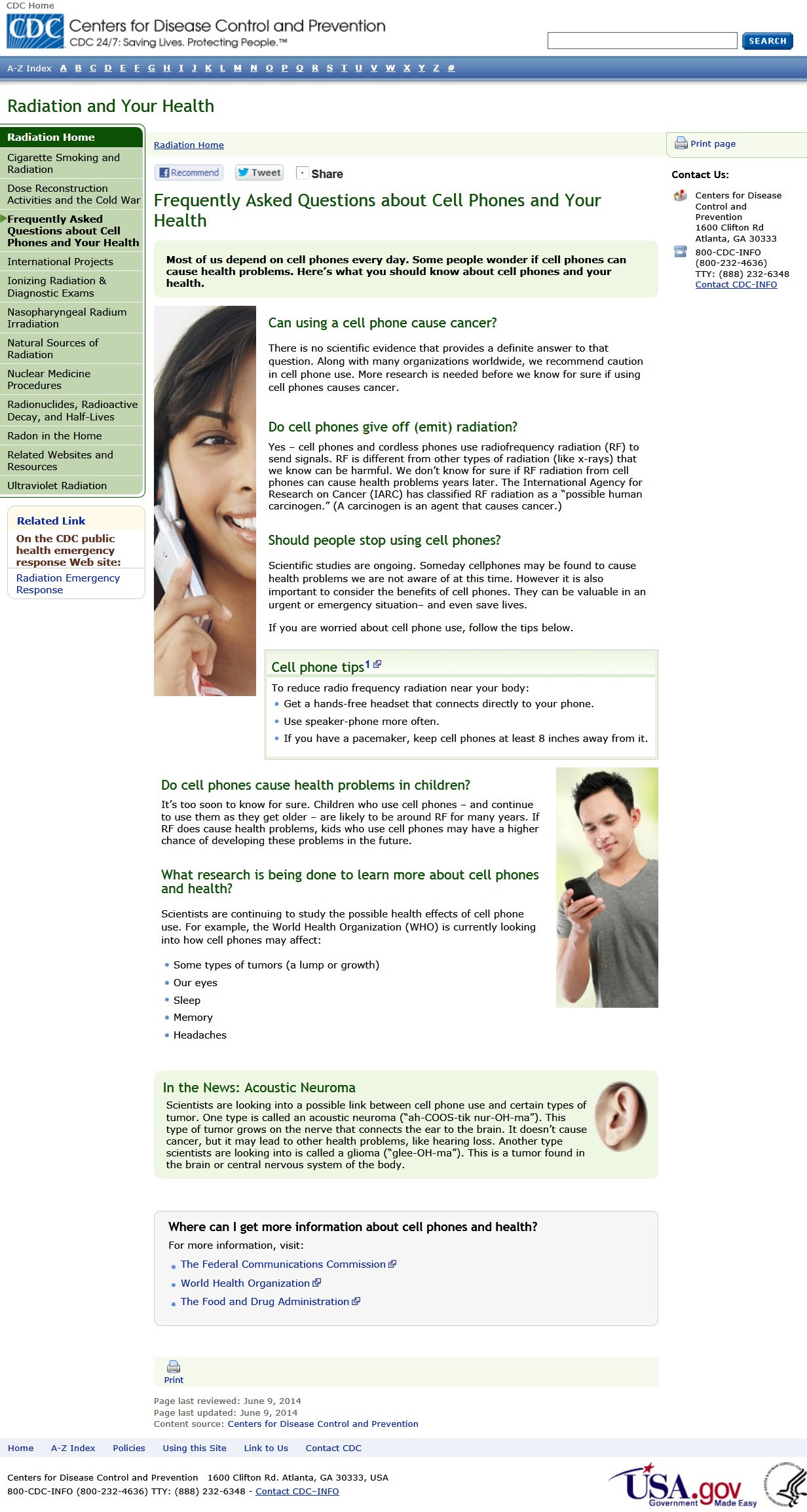 In June 2014, the U.S. Centers for Disease Control and Prevention (CDC), revised its webpage for “FAQ About Cell Phones and Your Health” to state the following [1]: