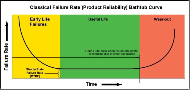 Reliability engineers model equipment failures with a bathtub shaped curve as shown.  There are early life failures that may be due to poor installation or quality control issues; there is a steady state region of the curve where you have relatively constant random failures; finally, there is a point where “wear-outs” begin to occur at an ever-increasing rate signaling the end of the useful life of the device.