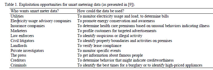 “An illustrative example of smart meter data exploitation is given in a recent NIST report [9]. Here, the authors impressively demonstrate how electric appliances leave special marks on the wire that can be tracked to learn about used devices and thus infer people’s habits. There are various parties who are particularly interested in meter readings; however, besides legitimate organizations using the data for billing or network services, many other use cases are not desirable, as summed up by Table 1. …